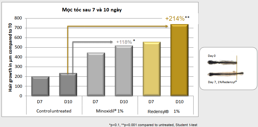 Theo xét nghiệm Philpott (xét nghiệm tăng trưởng nang tóc) : 24 nang tóc của bệnh nhân rụng tóc được thử nghiệm điều trị với Minoxidil 1% và Redensyl 1% trong 10 ngày. Sự dài ra của sợi tóc (µm) được đánh giá tại ngày thứ 7 và thứ 10