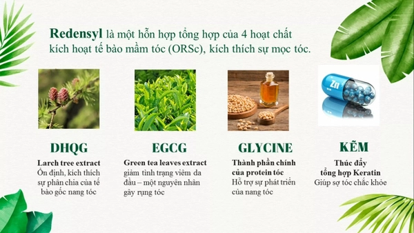 • Trong xịt tóc Redenyl có chứa thành phần Redensyl 3%. Đây là hoạt chất được tổng hợp từ DHQG, Glycerine, EGCG-glucoside, Kẽm. Những hoạt chất này có công dụng hiệu quả trong việc kích thích phát triển nang tóc, kiểm soát tóc gãy rụng, bảo vệ tóc, từ đó giúp tóc mọc được dày và dài hơn [1].