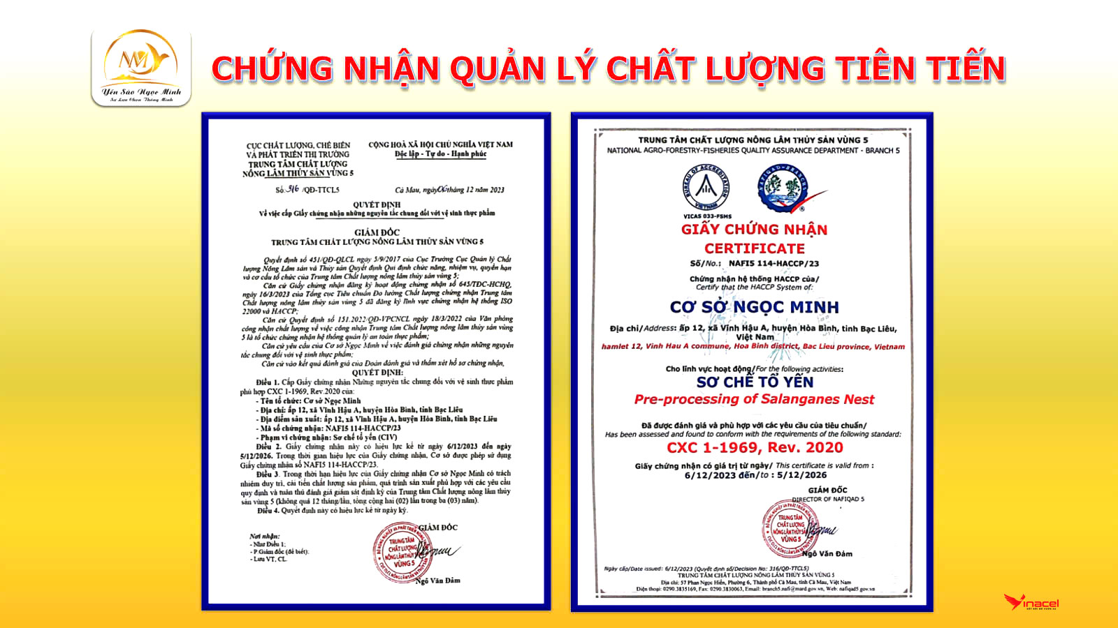 Tổ yến của cơ sở đảm bảo 100% thiên nhiên nguyên chất và được thu mua, tuyển chọn khắt khe từ các nhà nuôi yến từ hệ thống nhà yến chất lượng cao của cơ sở Ngọc Minh và những nhà yến trong tỉnh Bạc Liêu. Tất cả các sản phẩm của cơ sở yến sào Ngọc Minh đưa ra thị trường đều có giấy chứng nhận công bố tiêu chuẩn sản phẩm.