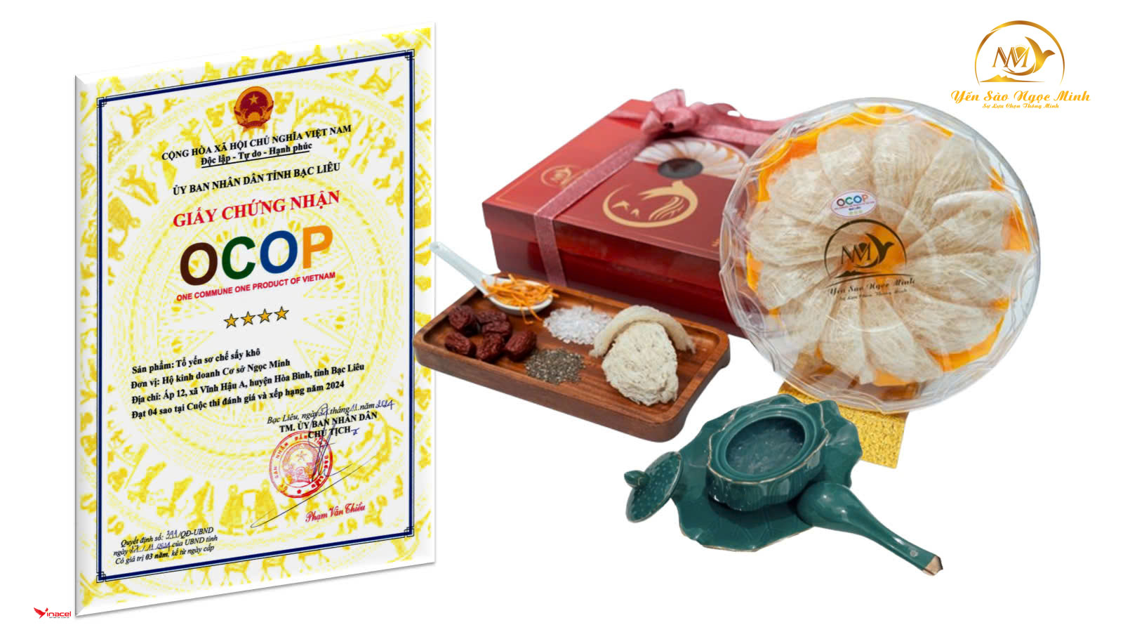 Tổ yến của cơ sở đảm bảo 100% thiên nhiên nguyên chất và được thu mua, tuyển chọn khắt khe từ các nhà nuôi yến từ hệ thống nhà yến chất lượng cao của cơ sở Ngọc Minh và những nhà yến trong tỉnh Bạc Liêu. Tất cả các sản phẩm của cơ sở yến sào Ngọc Minh đưa ra thị trường đều có giấy chứng nhận công bố tiêu chuẩn sản phẩm.