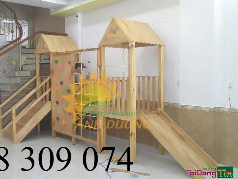 Cầu trượt liên hoàn gỗ sản phẩm được tùy chỉnh theo kích thước các mẫu cầu trượt ngoài trời tiêu chuẩn dùng cho trường mầm non với chất liệu gỗ tự nhiên đã qua xử lý kỹ lưỡng kết hợp mấu leo núi và máng trượt đôi bằng nhựa LLDPE có khả năng chống chịu tốt khi sử dụng ngoài trời.