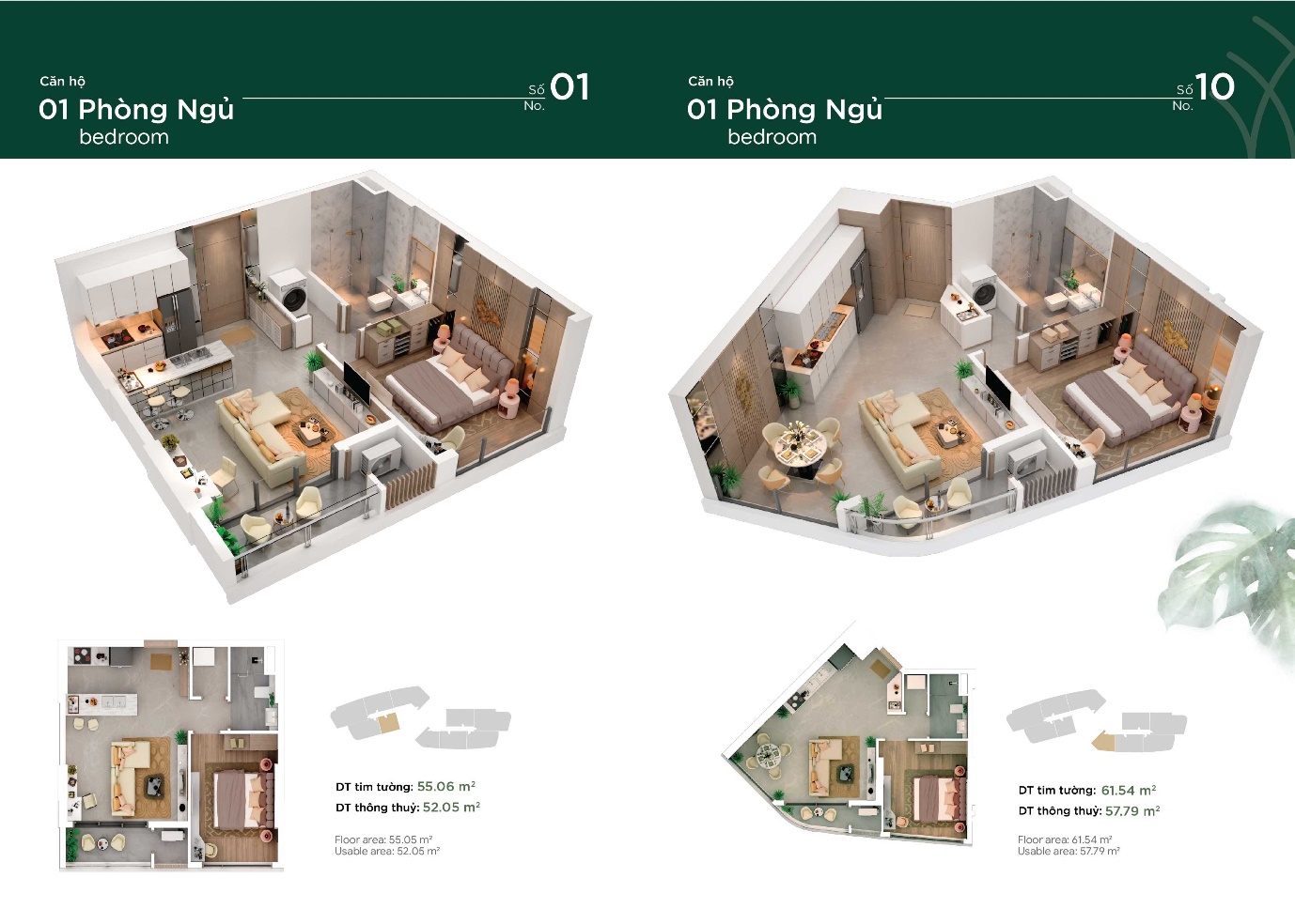 • Căn hộ 1 phòng ngủ diện tích từ 54.83 m2 - 61.61 m2