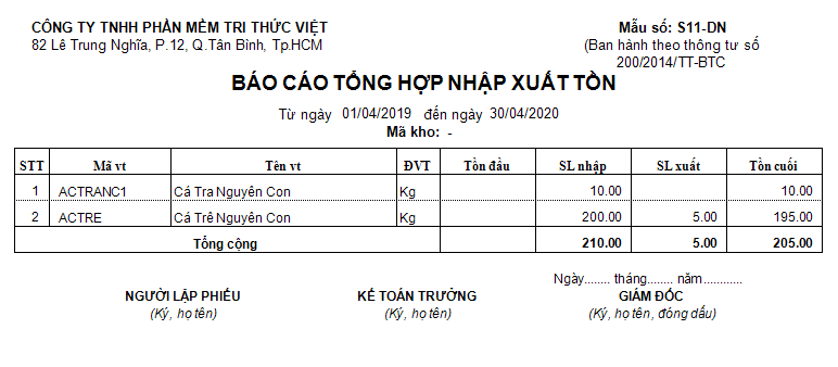 • Báo cáo nhập - xuất - tồn kho. Tồn 1 kho hoặc trên tất cả các kho, theo mặt hàng, nhóm hàng.