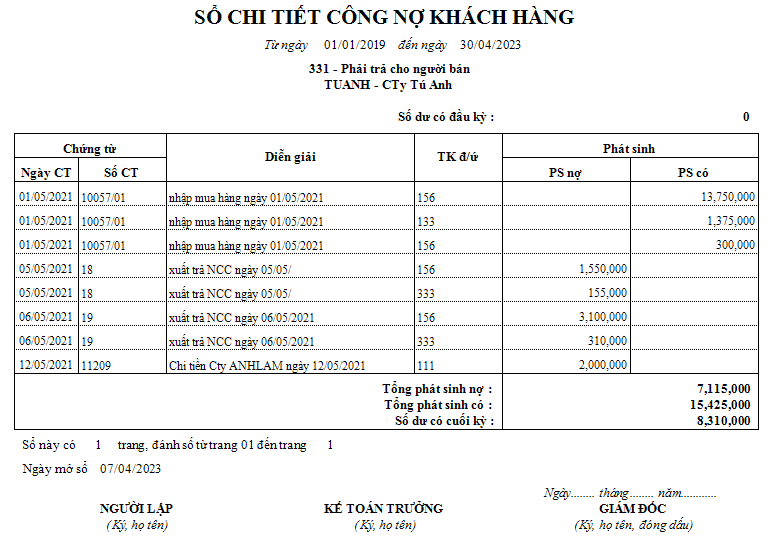 - Báo cáo công nợ phải trả nhà cung cấp;