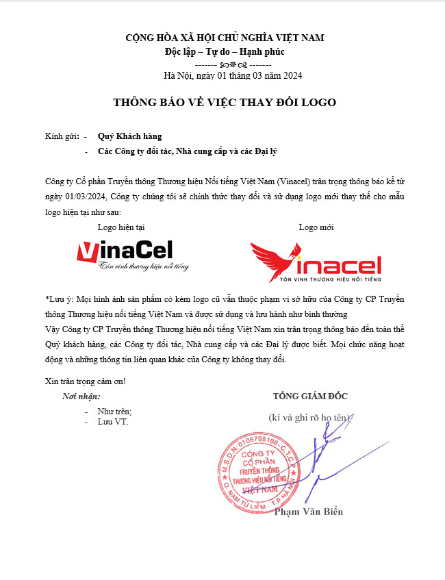 Với mục tiêu đẩy mạnh nhận diện thương hiệu cũng như mở rộng quy mô, khẳng định vị thế trên thị trường và xây dựng một hình ảnh mới phù hợp với định hướng phát triển của công ty. Do đó, từ ngày 29/02/2024, Công ty CP Truyền Thông Thương Hiệu Nổi Tiếng Việt Nam chính thức chuyển sang sử dụng logo mới.